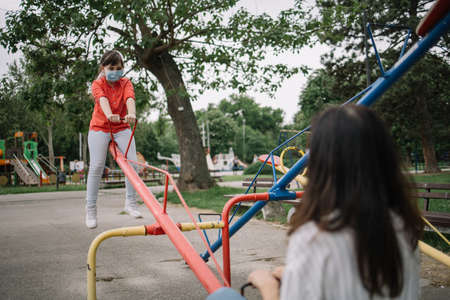 Mother and daughter playing in the park during pandemic.Little girl wearing protection face mask, rocking the chair in the playground with her mother