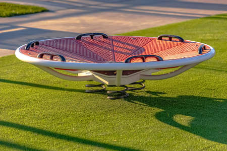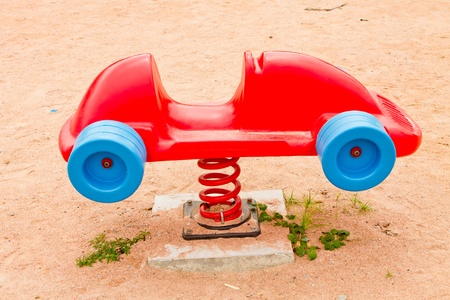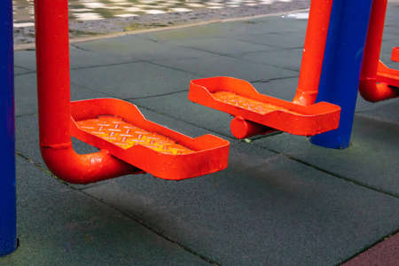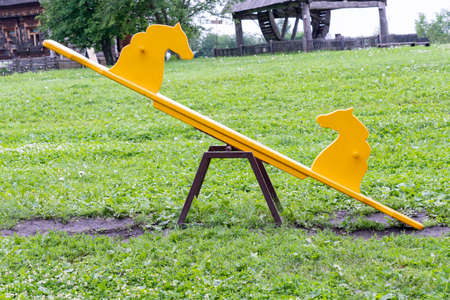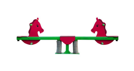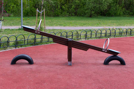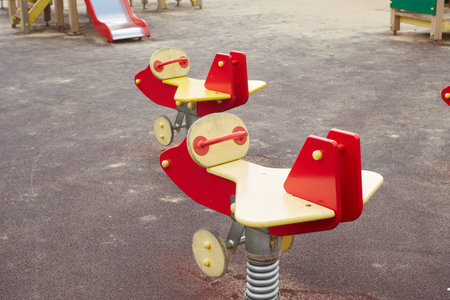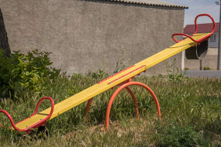 Red seesaw in the playground. Playground equipment for children to play. Plastic seesaw or teeter-totter, swing, and slide at outdoor playground with green grass ground. Outdoor kids toy at park.