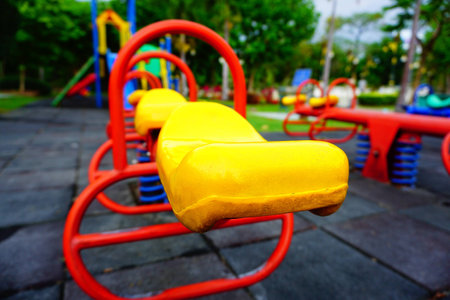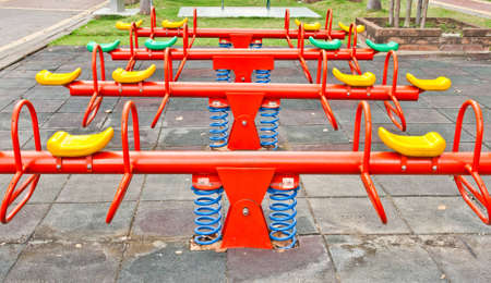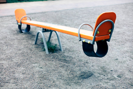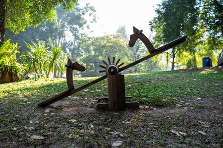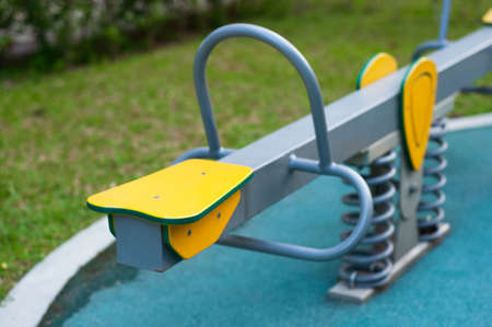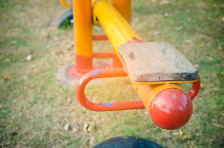 Close up seesaw in outdoor playground. Copy space of health care and activity concept. Shallow depth of field. Vintage tone filter color style.