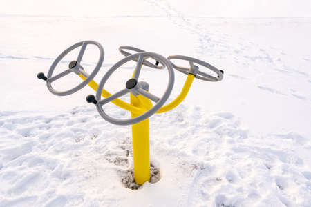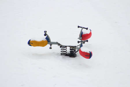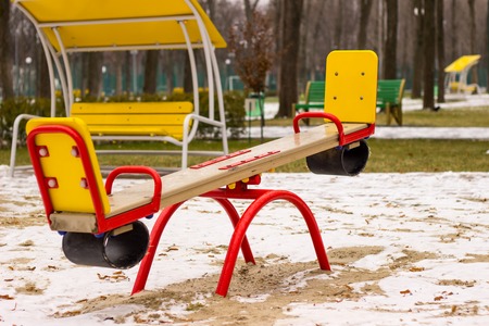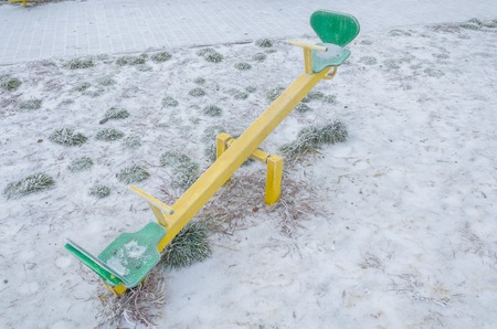 Empty playground in winter, swing tree metal multicolored funny flip flap. Lots of white snow with traces, cold weather no people