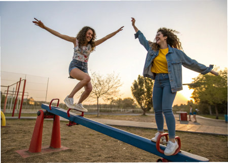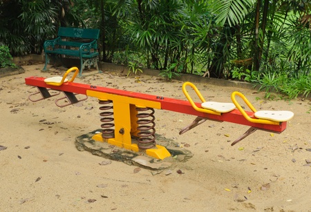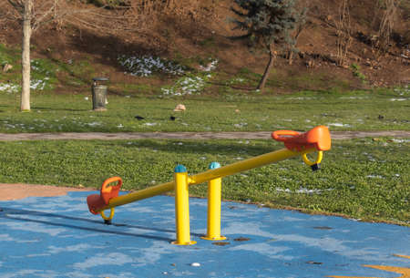 Cyberjaya, Malaysia - November 06, 2020: An abandoned seesaw in a playground. Playgrounds are blocked for use in the Corona Lock downs. Covid-19 also prohibits children from playing outdoors.