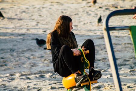 Tel Aviv Israel January 10, 2020 View of unidentified Israeli kid having fun on the beach of Tel Aviv during a sunny day in winter