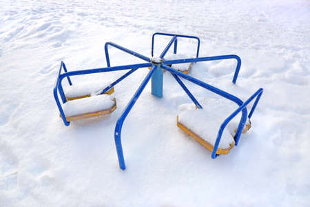 Snowy children playground and swings are covered with snow. Three colorful seat swings with handlebars in the middle of a snowy playground.