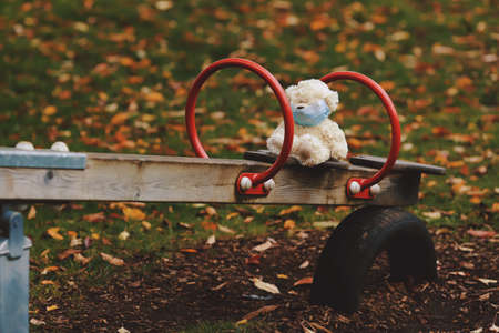 white teddy bear soft toy with disposal face mask sits lonely on a wooden seesaw of an outdoor playground - social isolation concept during global pandemic that children suffer from