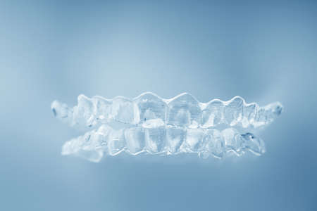 Invisible dental aligners modern tooth brackets transparent teeth braces to straighten teeth in cosmetic dentistry and orthodontics.
