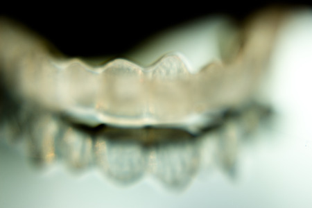 Right side view of a clear aligner or retainer for the lower teeth, a recent modern innovation for orthodontic patients who wish to have invisible braces.
