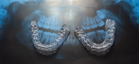 Transparent bite correction trays and x-ray of the jaw. Orthodontist equipment