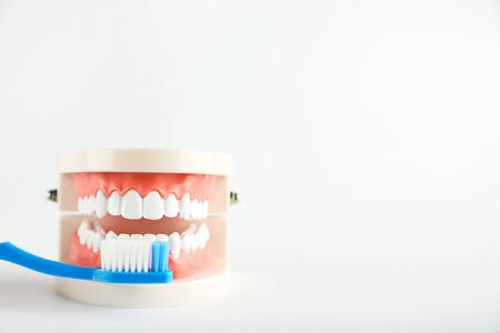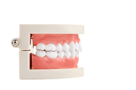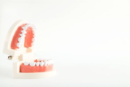close up of artificial model of people teeth over white background with copy space