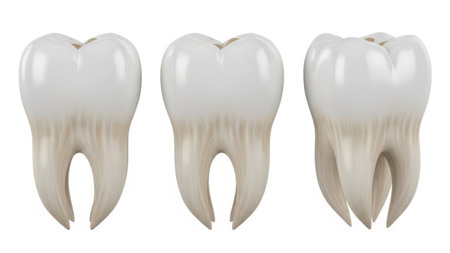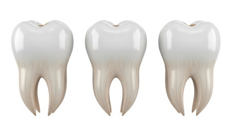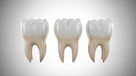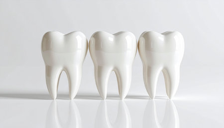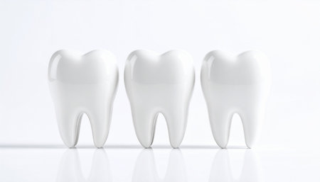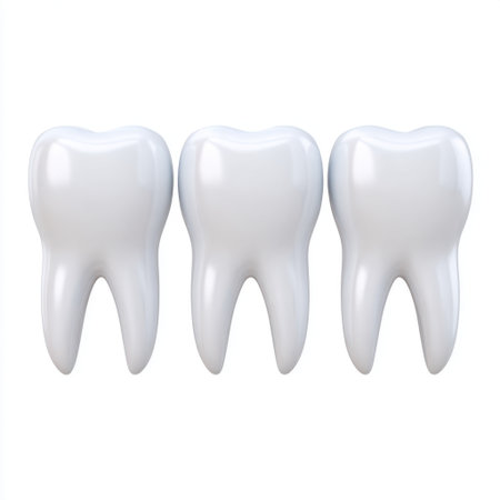 A close-up view of three pristine white human molars, their roots visible, positioned on a bright white reflective surface.