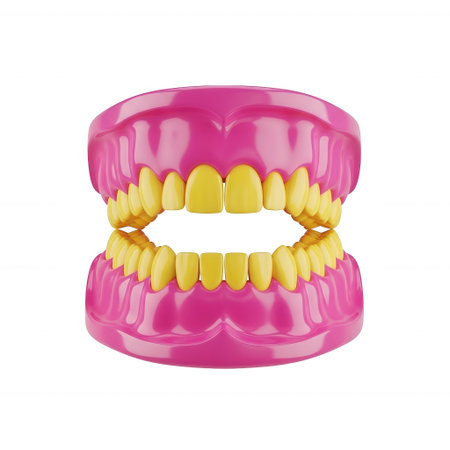 3D rendering of a bright pink dental model showcasing yellow teeth, ideal for dental care, orthodontics, and dental health education. Highlights teeth alignment and dental hygiene practices in a dental clinic setting.