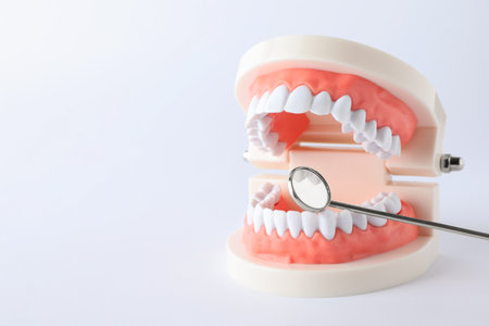 Typodont teeth and dentist mirror on white background. Space for text