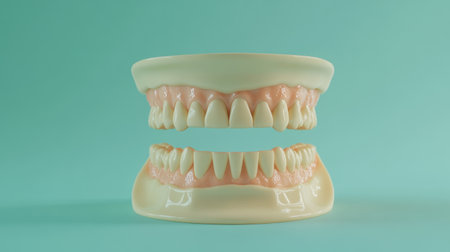A detailed dental model featuring upper and lower teeth on a clean, light green background, symbolizing professional oral care