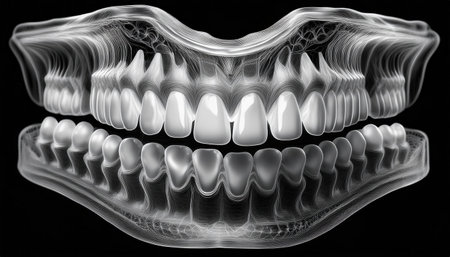 Detailed view of dental anatomy with close-up of upper and lower human teeth arrangement.