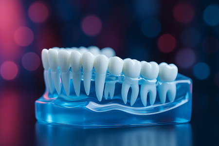 AI generated realistic close up of transparent plastic jaw model showing white artificial teeth with visible roots under colorful abstract lighting for dental education and anatomical reference