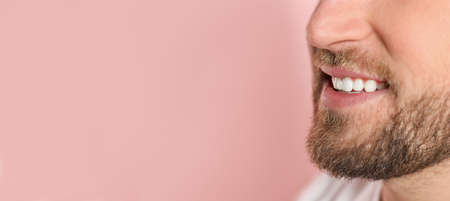Closeup view of young man with healthy teeth on pink background, space for text. banner design