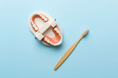 A plaster model of the jaw and an eco-biological bamboo toothbrush lie nearby. Waste Disposal. Dentures. Caring for teeth and oral cavity. Copy space