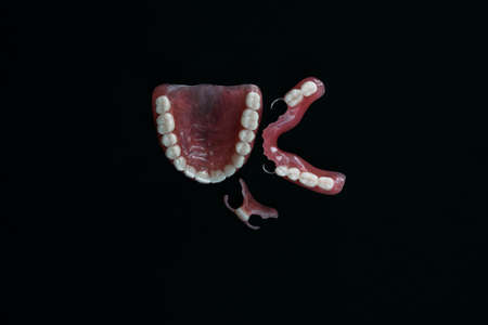 Dentures on a black background. Close-up of dentures. Dentistry is conceptual photography. Prosthetic dentistry. False teeth. Prosthetics. Close-up of plastic dentures. Teeth on a black background