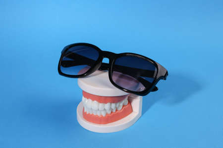 Minimal summer concept. Plastic model of a human jaw with sunglasses on blue background