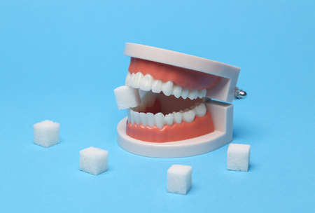 Human jaw model with sugar cubes on a blue background. Harm of sugar and sweet for teeth, caries