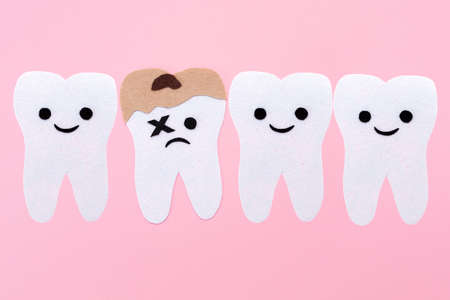 A row of teeth with cartoon faces carved out of felt. One tooth is affected by caries. Pink background. Copy space. The concept of stomatology and oral hygiene.