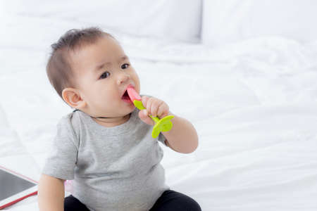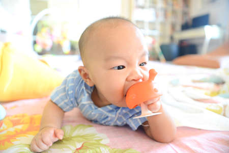 Cute little Asian baby boy chewing teething, Baby first toy