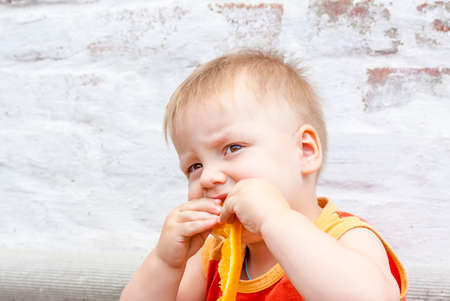 Portrait of child. Cute boy posing with an orange. The emotions of a child. Portrait of a boy against a brick wall.