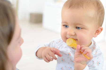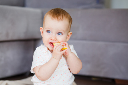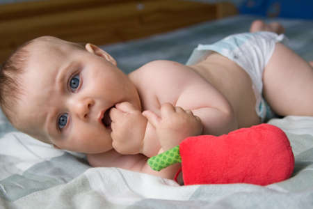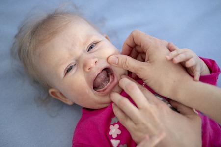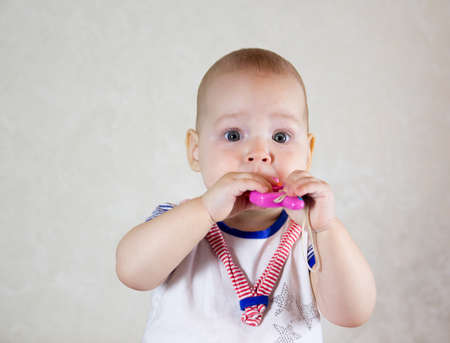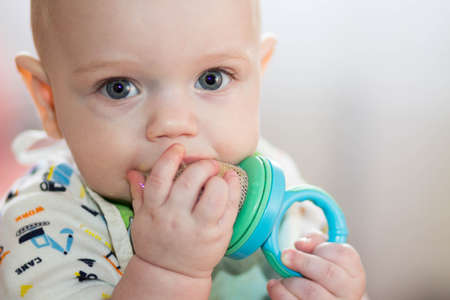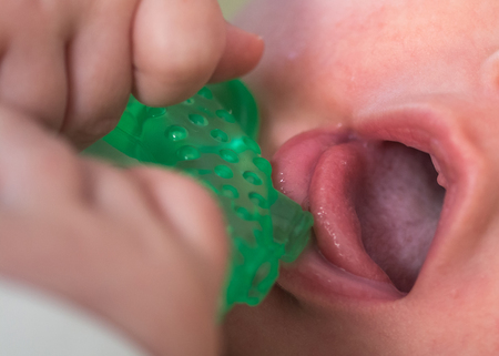 teething, the first tooth in a child. the child gnaws a toy.