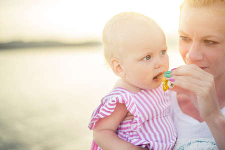 Woman holding her cute little daughter on hands and help her with a babys dummy