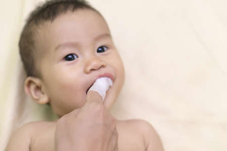 Mother cleans 8 months old baby mouth with a boiled gauze