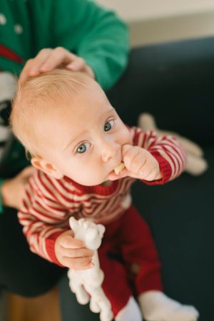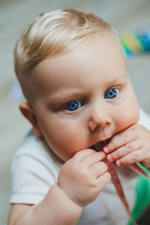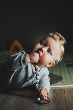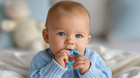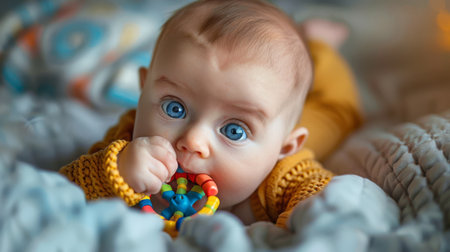Baby explores blue teething toy in inviting and warm indoor setting. Colorful soft furnishings create a comfortable atmosphere. Concept of parenting, baby care, child development.