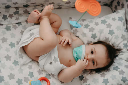 Little baby playing with toys. Small child chews on a toy