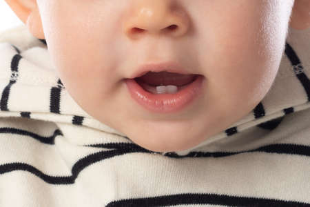 Cropped image of a babys mouth open showing his first teeth, nose and his upper body, but not showing his eyes.