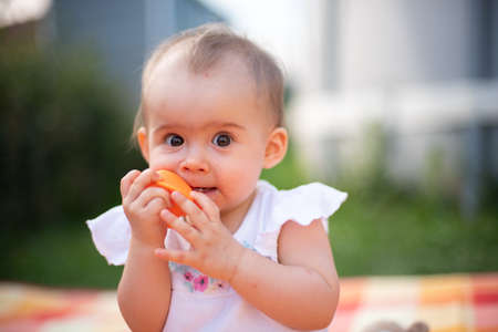 Eight months old baby girl sucking her red, green and orange toy