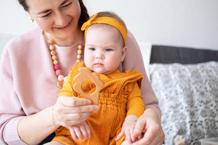 happy woman play with her baby daughter. Baby girl play with wooden teether