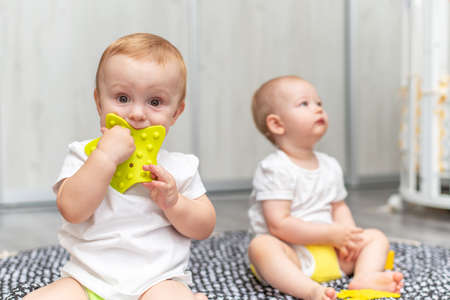Cute happy kids play together on the floor with toys and take them into mouth