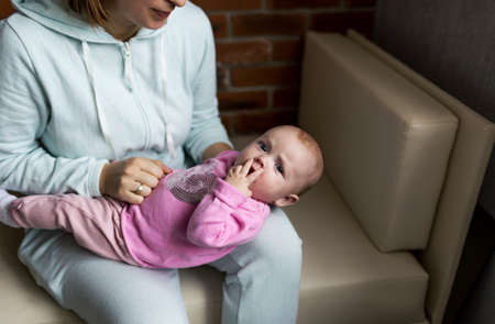 Close-up authentic portrait of a Caucasian cute baby boy lying on his tummy while his loving mom changing nappy on the couch at home. Childcare. Baby care.