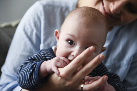 Unrecognizable young mother holding her baby son in her arms