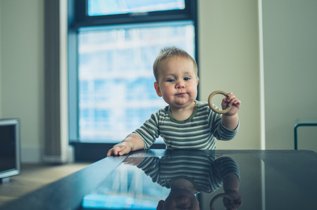 A cute little baby with a teething ring is standing by a coffee table