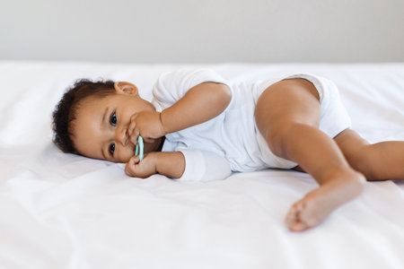 Teething Concept. Cute Little Black Baby Biting Teether While Lying In Bed
