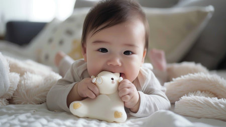 Baby Playing With Soft Toy on Cozy Bed in Bright Room