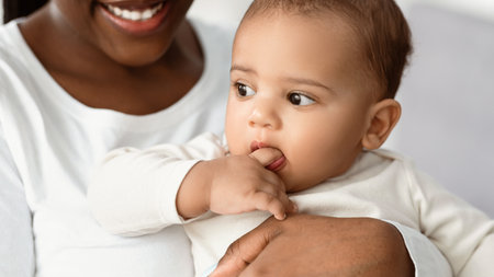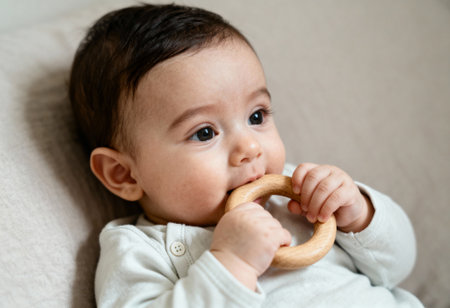 Curious baby chewing on a silicone teether while sitting on a cozy sofa in a bright living room during daytime.