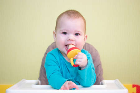 baby toddler 5 6 months boy girl sits on a high chair and eats fruit from a nibbler. kid child learns to eat independently. the caucasian baby is sitting on the highchair, portrait soft focus