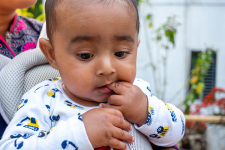 Portrait of attractive adorable innocent cute sweet healthy baby several days old licking finger at home indoors