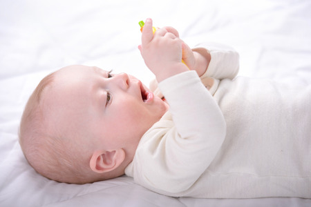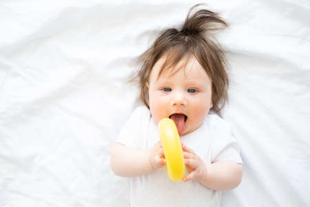 cute baby boy lying on bed and play with yellow plastic circle toy