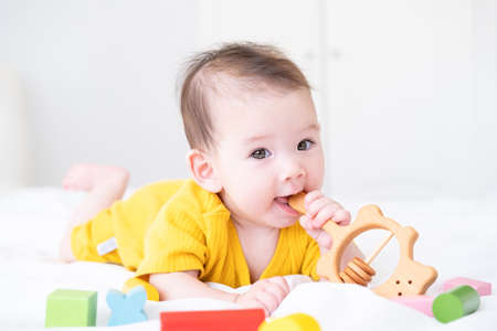 healthy asian baby girl in yellow bodysuit plays with wooden toy teether for teeth on white bedding