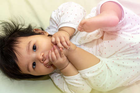portrait close up asian cute baby in sleepwear sucking toes after wake up happily on the bed in room