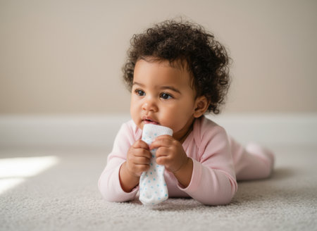 Curious baby girl in pink onesie lying on soft carpet, holding and chewing a polka dot sock, natural indoor lighting.