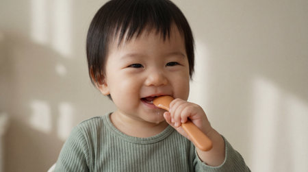 Smiling toddler in green shirt chewing on silicone spoon while sitting indoors in soft natural light.
