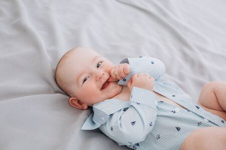 Three month baby boy lies on stomach and puts a toy in his mouth