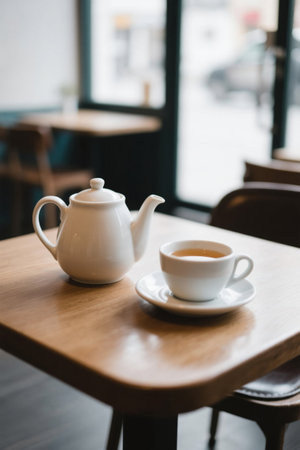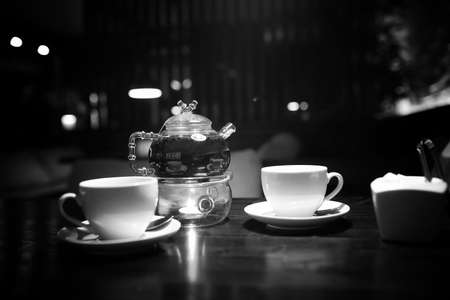 Teapots and cups on the table in the cafe